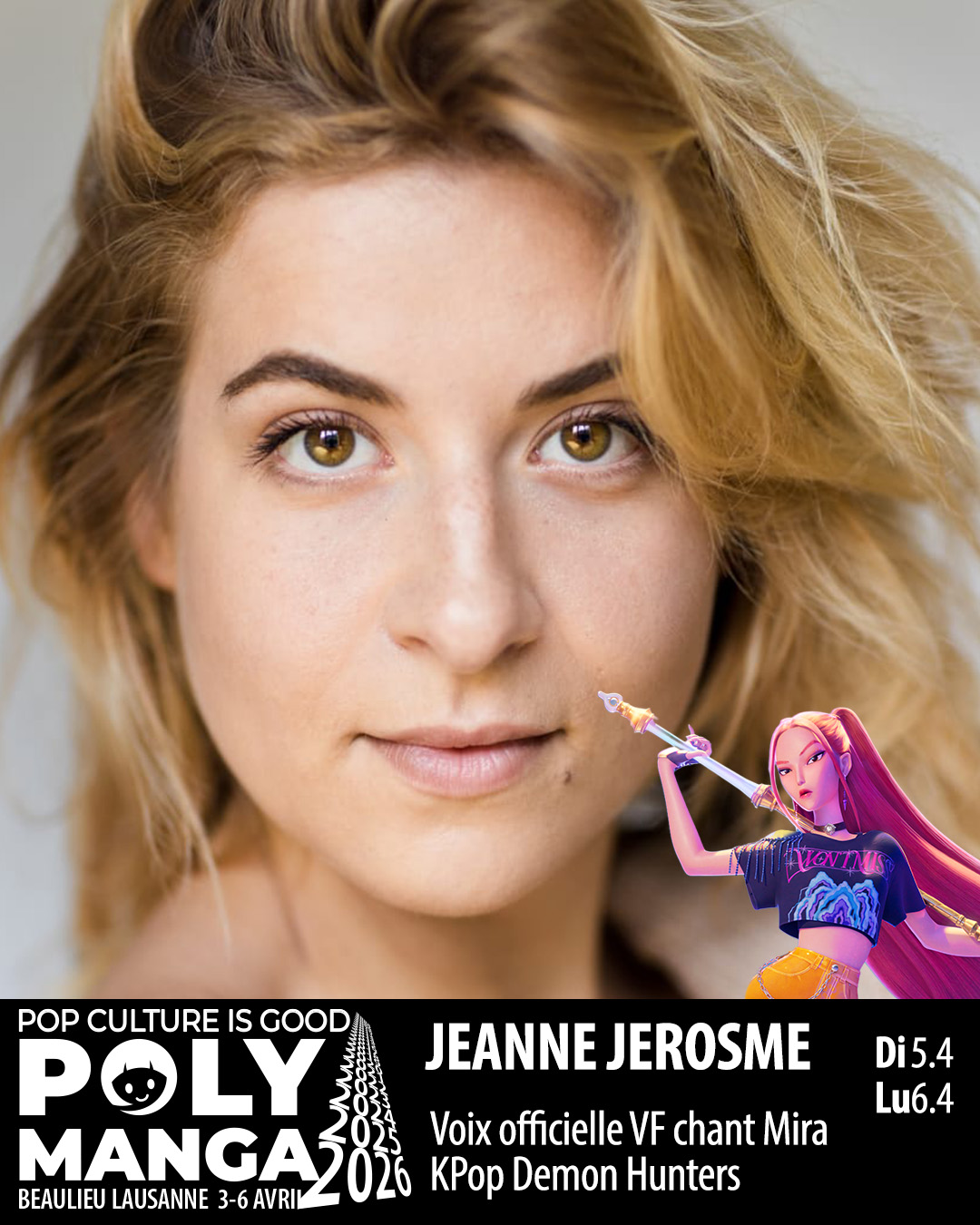 Mini concert et conférence avec les voix françaises de Kpop Demon Hunters. Après l’énorme succès à Nantes le mini concert des voix françaises débarque à Polymanga Lausanne les 5 et 6 avril. Le concert sera accompagné de séances de selfies/dédicaces ainsi que d’une conférence.