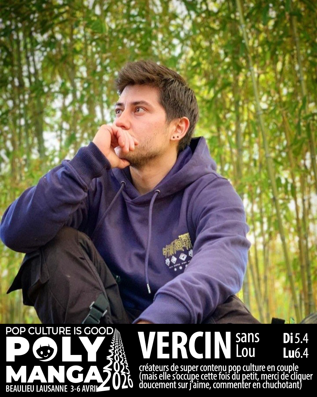 Il arrive ! Vercin (sans Lou) à Polymanga Lausanne les 5-6 Avril pour une conférence et des dédicaces. Vercin & Lou Le nouveau duo ultra rafraichissant de la pop culture – ils sont beaux, ils sont sympas, ils sont drôles, ils sont vrais… et ils sont même parents depuis peu ! C’est pour ça que Vercin viendra seul car Lou s’occupe cette fois du petit: merci de cliquer doucement sur j’aime et commenter en chuchotant.