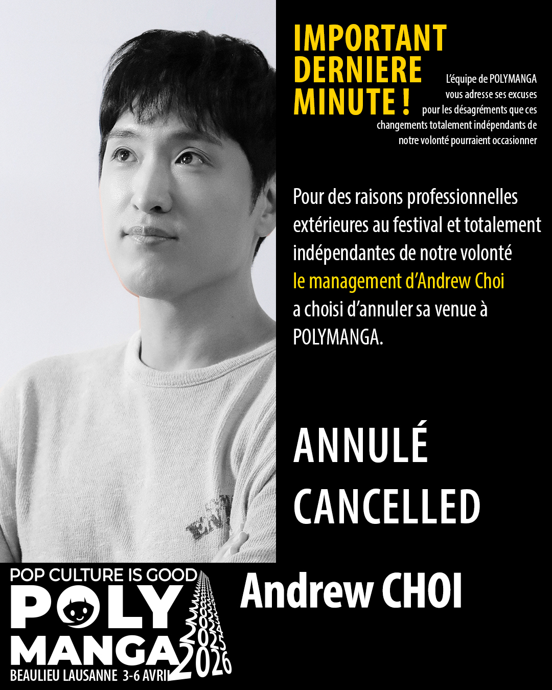 Pour des raisons professionnelles extérieures au festival et totalement indépendantes de notre volonté le management d’Andrew Choi a choisi d’annuler sa venue à POLYMANGA.